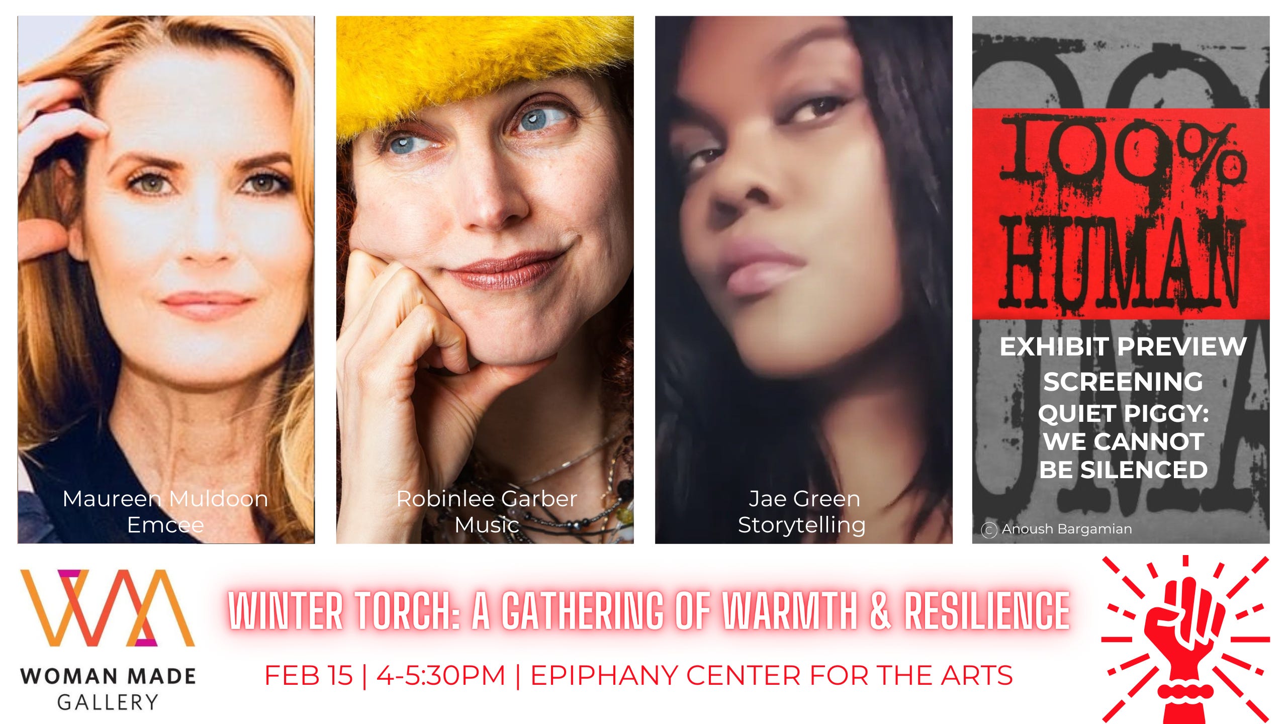 Escape the cold and chaos outside and step into the warm embrace of Winter Torch! Presented by Woman Made Gallery, this gathering celebrating sisterhood blends the soulful acoustic guitar of Robinlee Garber, along with the powerful storytelling of Maureen Muldoon and Jae Green, illuminating voices too often left unheard. At the heart of the evening, the screening of Woman Made Gallery’s virtual exhibit - Quiet Piggy: We Cannot be Silenced, serves as a backdrop and a beacon—representing collective voices of resistance that will not be silenced. Together, the music, storytelling, and exhibit form a chorus of resilience, reminding us that creativity is a radiant torch against the darkness.